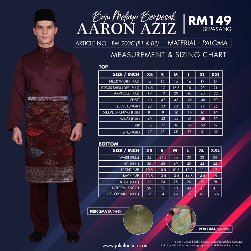 Add to Cart Top. Ready To Wear BAJU MELAYU AARON AZIZ PALOMA IN DEEP DUSTY PINK 0011 PACKAGE SAMPIN BUTTON. Dari awal pagi lagi pelanggan setia Jakel dah beratur panjang untuk mendapatkan 300 baju melayu percuma untuk yang terawal sampai di Jakel Shah Alam dan 200 lagi percuma untuk setiap pembelian.