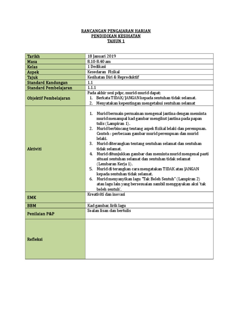 Rancangan pengajaran harian pendidikan kesihatan. 511 Membuat persediaan diri sebelum semasa dan selepas melakukan aktiviti. RANCANGAN PENGAJARAN HARIAN PENDIDIKAN JASMANI KESIHATAN TAHUN 1 Matapelajaran.